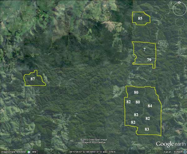Rough map of 4 seperate plantation/native forest sites and approximate years when plantations were established. Note almost 500ha planted between 1980-84 would have been established with Atrazine @ 4L/ha and Amitrole @ 7L/ha. Meaning 2000L of Atrazine and 3500L of Amitrole sprayed into Deadlock Creek catchment between 1980-84.