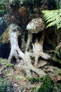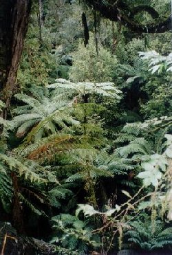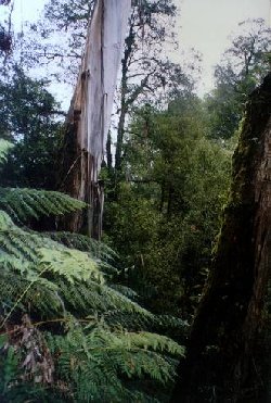 93-107a: Merriman's Creek Rainforest. June 1998. Logging right up to Cool Temperate Rainforest Buffer by Victorian Plantation Corporation. Hancock have since sacked the forester responsible for this blatant disregard for adequate protection of cool temperate rainforest. Note Myrtle Beech and Old Growth Ash in buffer. Buffer replanted with Shining Gum.